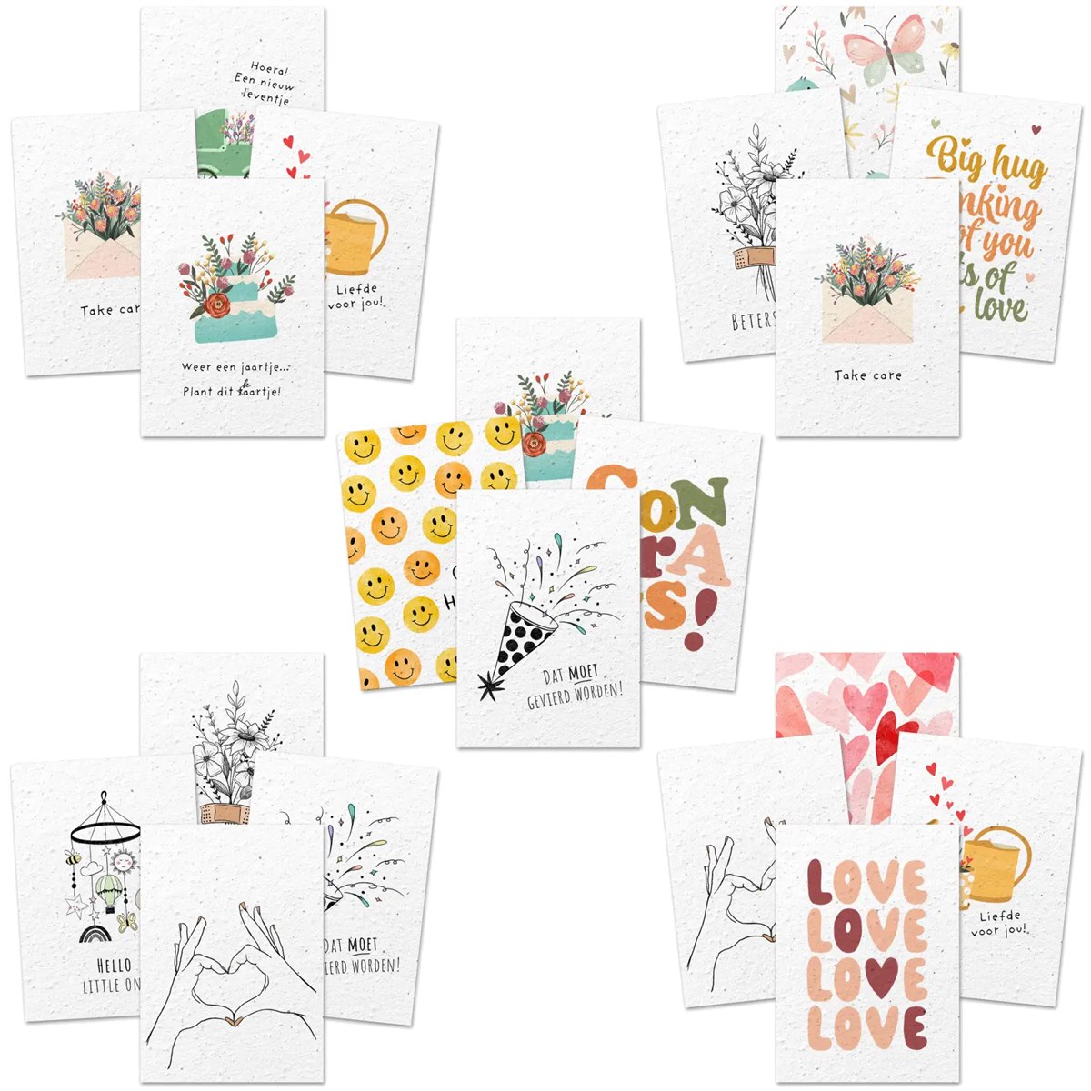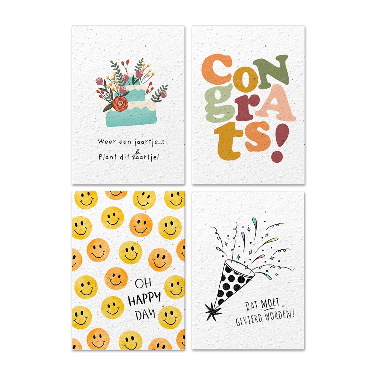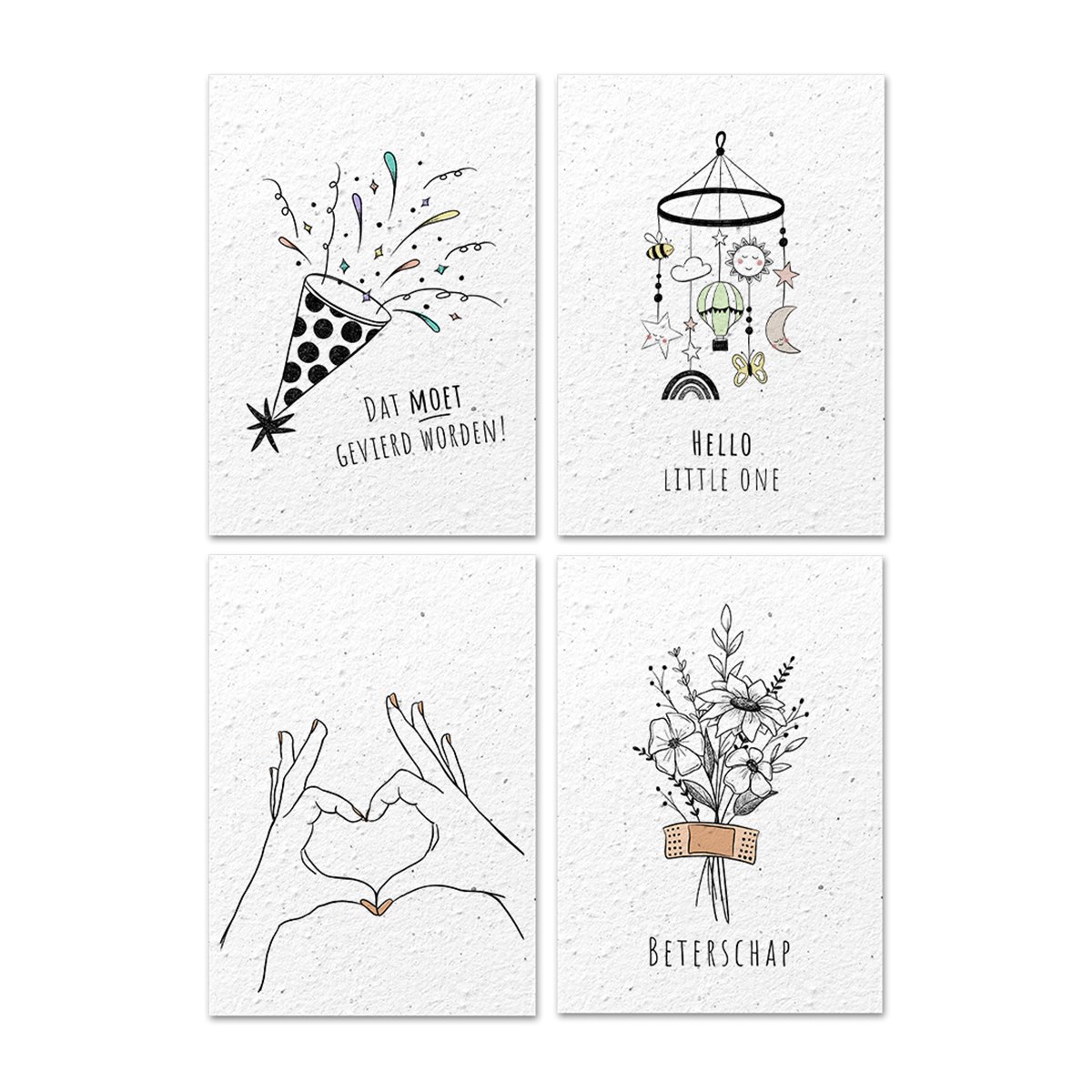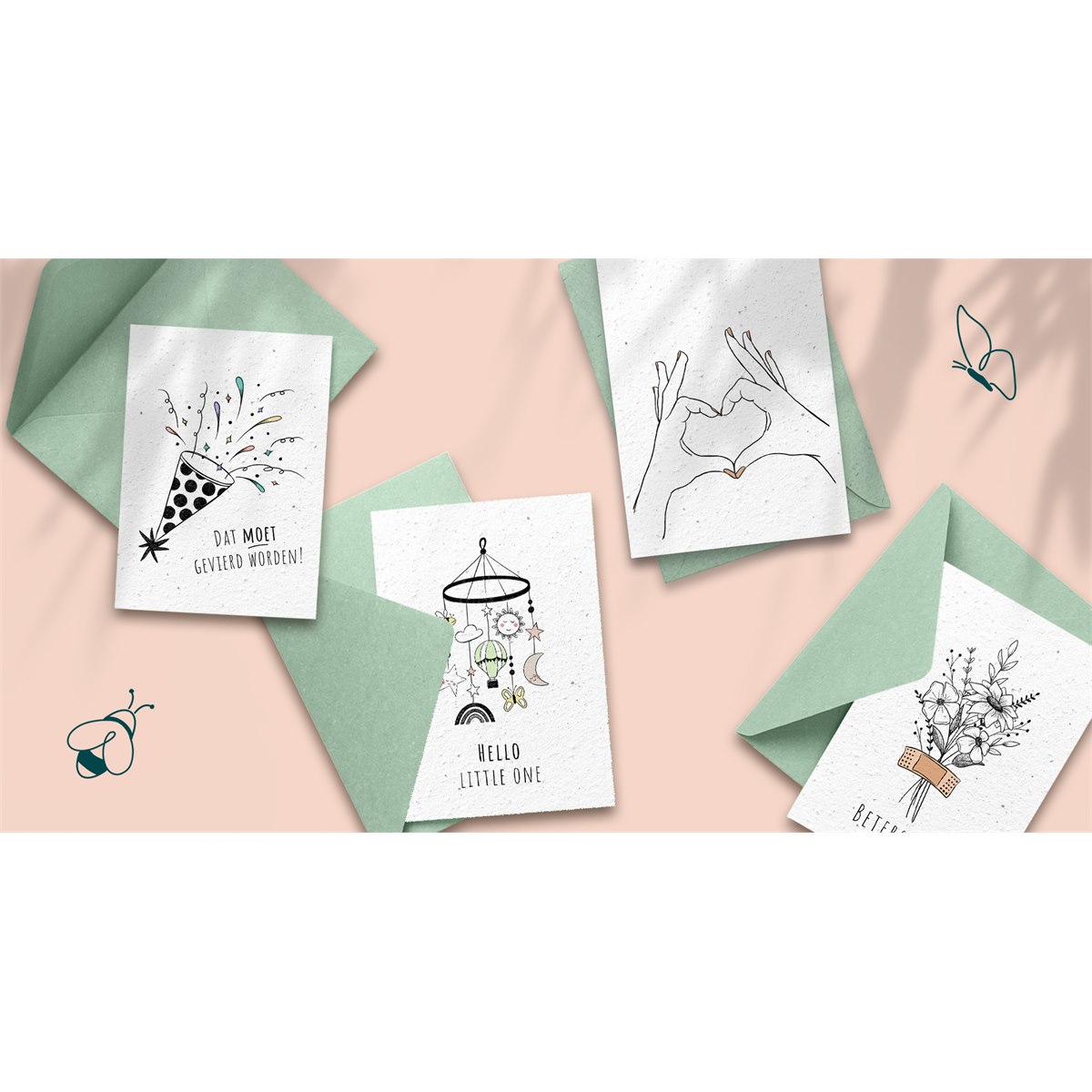 Duurzame groeipapier kaartenset met 4 verschillende kaarten met enveloppen van Growingpaper. De kaarten zijn gemaakt van 250 g/m² groeipapier, ook wel zaadpapier, bloemenzaadpapier, bijenzaadpapier of plantbaar papier genoemd. Het papier bevat een bijen-/vlindermix bloemzaadjes welke je binnen of buiten kunt 'planten'. Een dubbel cadeau om iemand blij mee te maken, je stuurt niet alleen een kaartje maar ook nog een cadeautje in de vorm van bloemzaadjes die tot vrolijk bloemen uitgroeien. Er zijn 5 sets met ieder 4 verschillende kaarten beschikbaar.