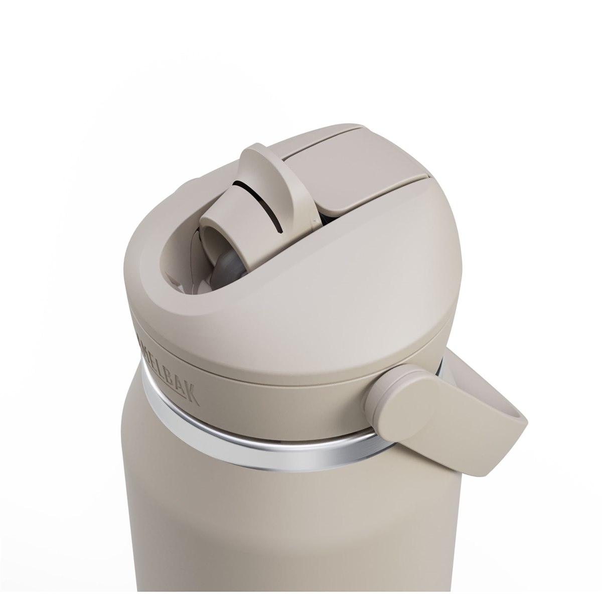 De CamelBak Thrive Flip Straw RVS thermosfles is een prettige drinkfles voor onderweg. Hij is 100% lekvrij wanneer je de drinktuit dicht klapt en dankzij de vacuüm-geïsoleerde roestvrijstalen wand blijft je drankje tot wel 10 uur koel. De dop van de fles is voorzien van een zachte siliconen drinktuit met een ingebouwd ventiel dat is verbonden met een rietje (“flow-valve”). Hierdoor zuig je eenvoudig de vloeistof omhoog zonder de fles te kantelen of het mondstuk in je mond te bijten.