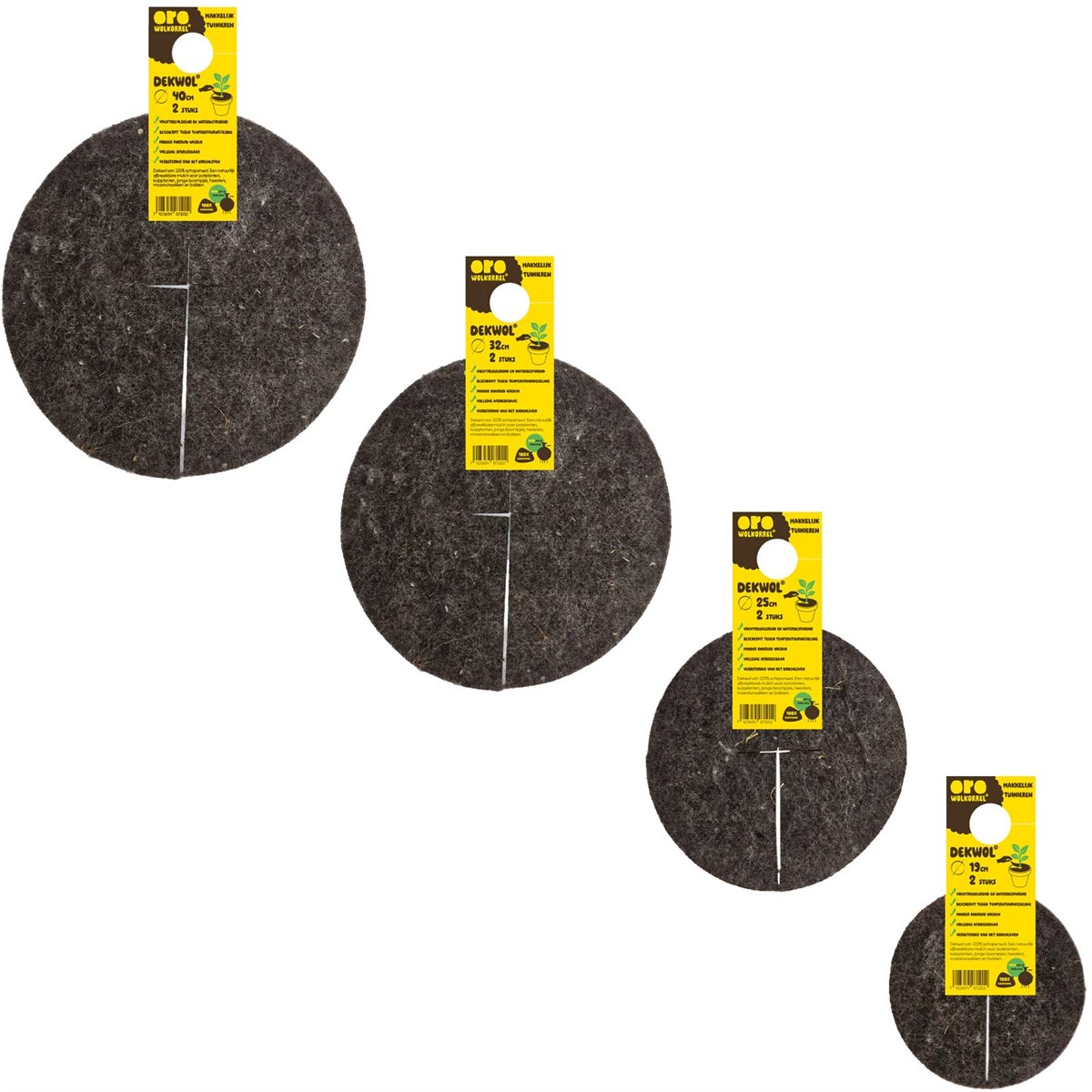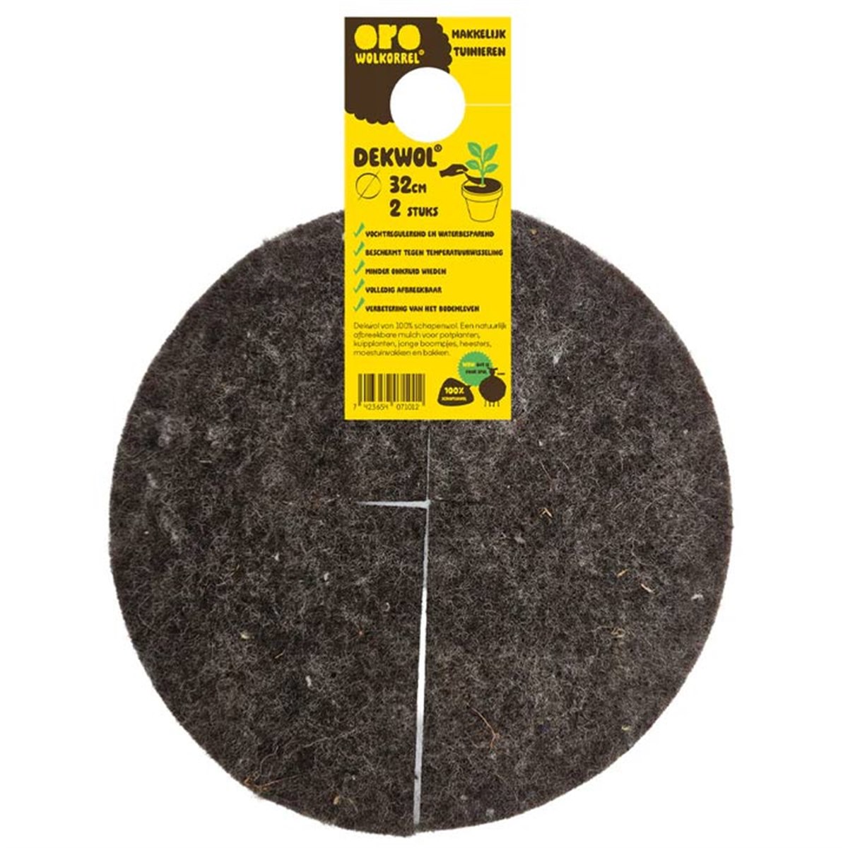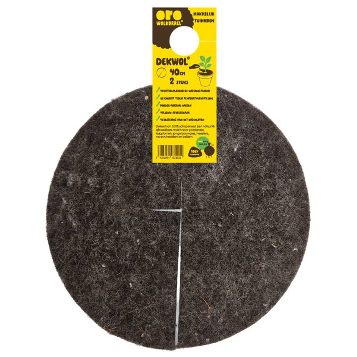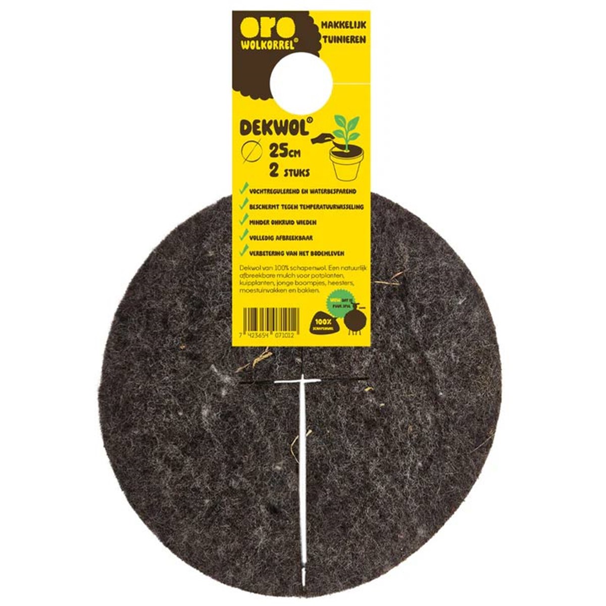De dekschijven zijn een natuurlijk afbreekbare mulch‑oplossing voor potplanten, kuipplanten, jonge boompjes, heesters, moestuinvakken en bakken. Dekwol werkt als een waterbuffer: het houdt vocht vast waardoor de grond minder snel uitdroogt, helpt wortels sterk en gezond te groeien, vermindert onkruidgroei, zorgt voor extra verkoeling in de warmte en biedt bescherming tegen vorst in koude periodes, allemaal zonder kunstmest of schadelijke stoffen.