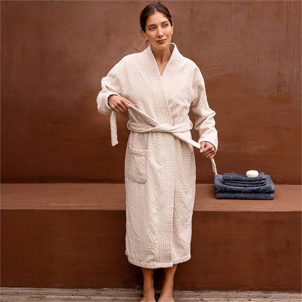 De velours badjas van Yumeko is gemaakt van 100% biologisch katoen, GOTS-gecertificeerd, en voelt heerlijk zacht aan. De buitenkant van zacht velours en de binnenkant van absorberend terry zorgen samen voor een goede balans tussen warmte en comfort. Of je nu op een regenachtige ochtend je eerste kop koffie pakt, na een lange werkdag onder een warme douche stapt, of heerlijk op de bank met een boek ontspant, deze badjas omhult je als een zachte cocon.