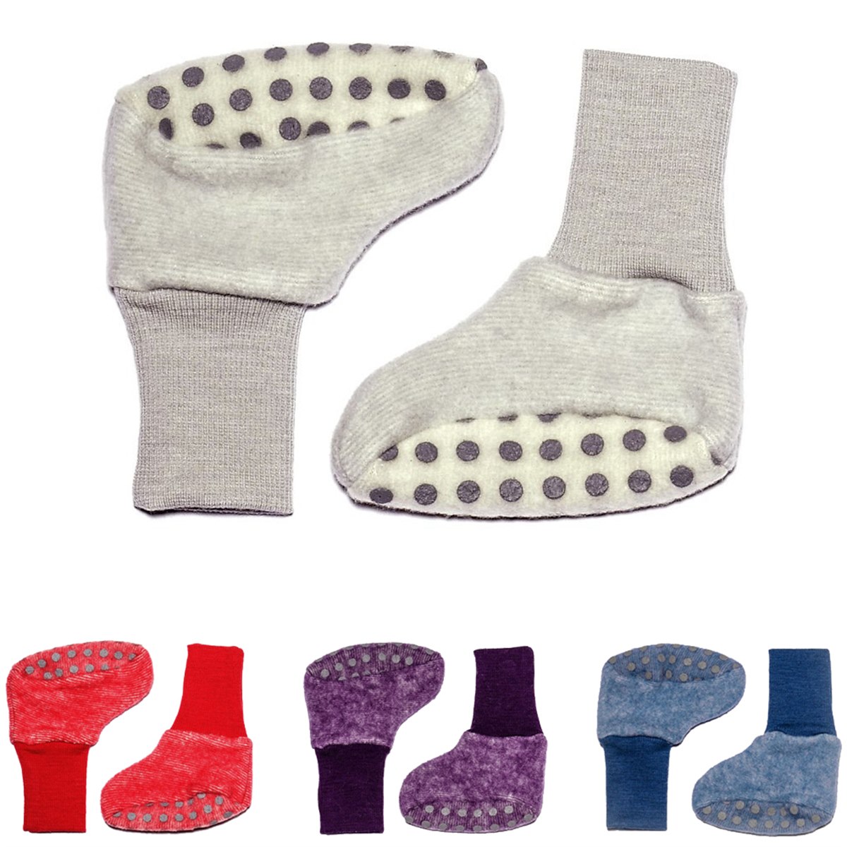 Zachte fleece babyslofjes van circa 60% biologische wol en 40% biokatoen. Houden de voetjes van je baby lekker warm. De slofjes zijn verkrijgbaar in drie maten en hebben een antisliplaag onder de slof zitten, die zorgt voor extra grip, ook op gladde vloeren. Door de elastische boord blijven de slofjes goed zitten, er zit circa 3% elastaan in de boord.