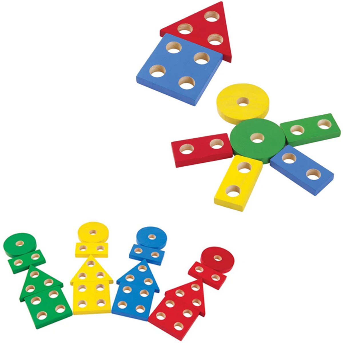 Het bord bevat vier basisvormen (cirkel, vierkant, rechthoek en driehoek) in vier heldere kleuren (geel, blauw, groen en rood). Kinderen leren vormen onderscheiden, kleuren herkennen en vormen matchen. Door vormen op de juiste plek te leggen en te stapelen volgens het aantal gaten, oefenen kleine handjes al basisbegrippen als sorteren, tellen, ruimtelijk inzicht en probleemoplossen. Fijne motoriek, hand-oog coördinatie en oog voor detail worden gestimuleerd bij elk stukje dat in het bord gelegd wordt.