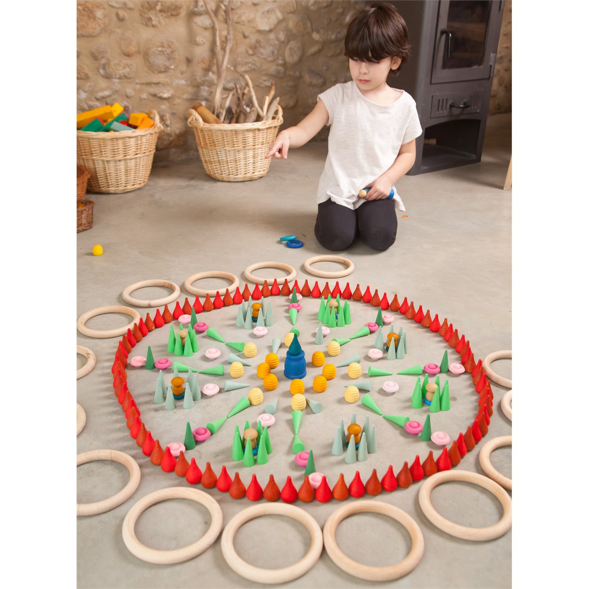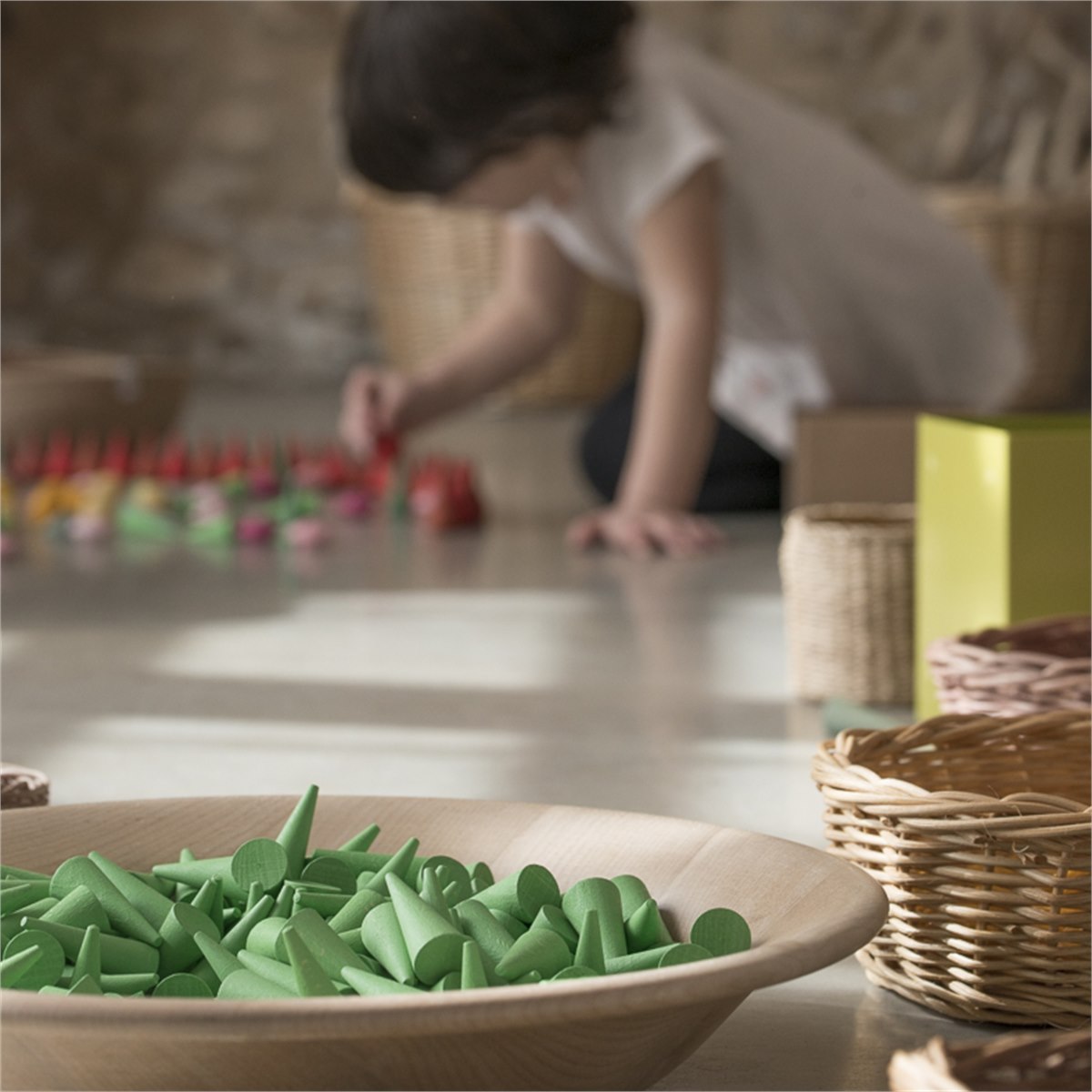 De Grapat Cones set bevat 36 kegels is 3 tinten oranje of 3 tinten groen. De kegels zijn verpakt in een kartonnen doosje. Met het ecologisch houten speelgoed kan op zichzelf gespeeld worden of toegevoegd worden aan andere Grapat sets. De Mandala cones nodigen kinderen uit om hun fantasie te gebruiken om werelden en verhalen te creëren tijdens hun spel. De onderdelen kunnen op kleur, vorm of soort gesorteerd worden en door het spelen met de onderdelen wordt de fijne motoriek van het kind ontwikkeld. Ook kunnen ze gebruikt worden om mandala's te maken, bij rollenspel als geld of fantasievoedsel om mee te koken of op een Waldorf seizoens-natuurtafel neergelegd worden.