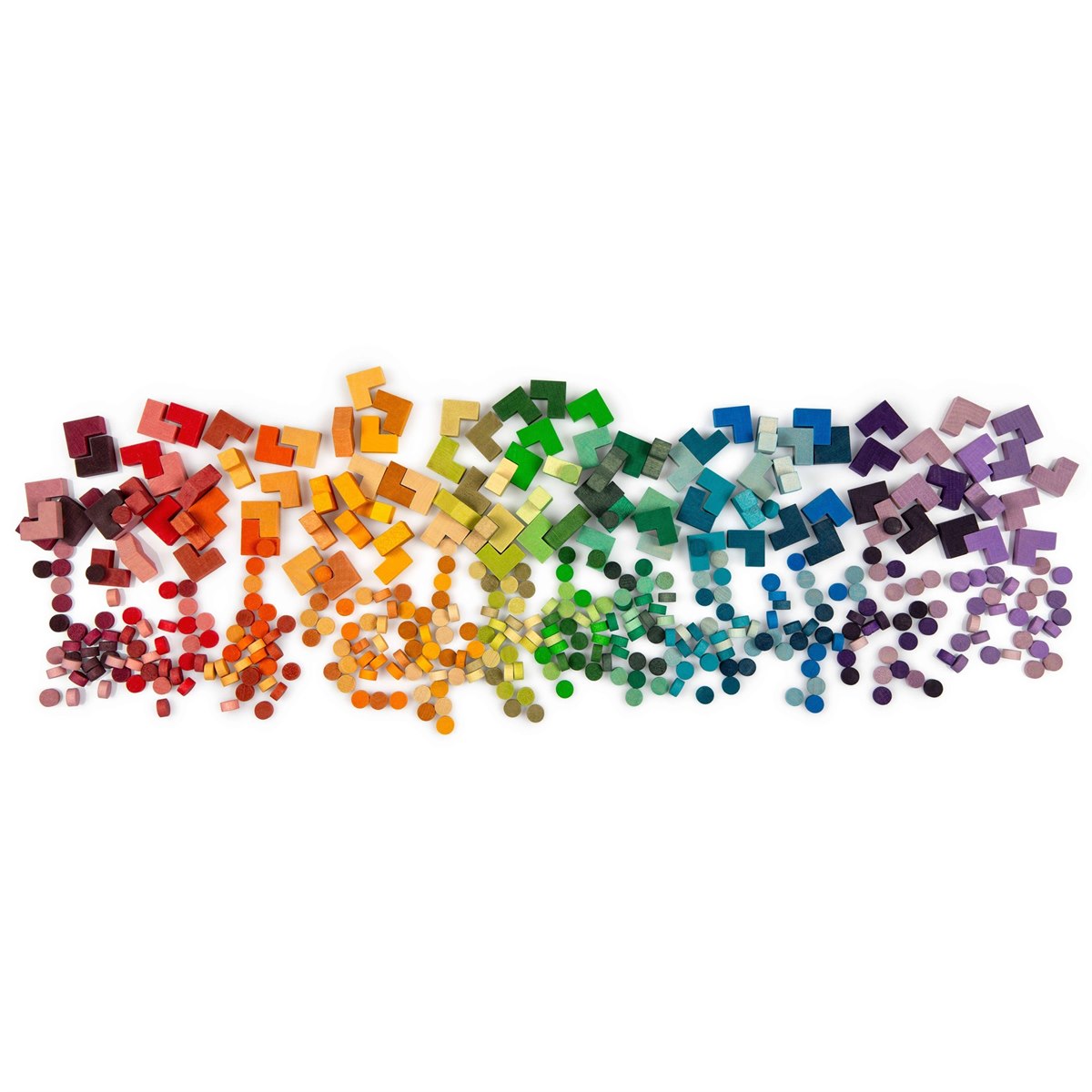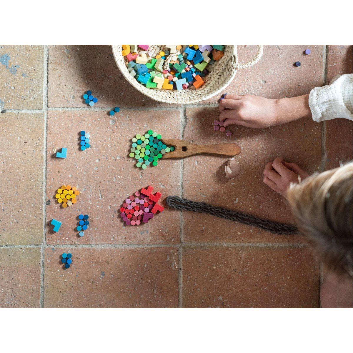 Dit duurzame houten speelgoed is ontworpen voor open ended play. Het stimuleert de fantasie, creativiteit en het probleemoplossend vermogen van kinderen. Er zijn geen spelregels: het kind bepaalt zelf hoe, waar en wanneer ermee gespeeld wordt. Door de houten vormen te classificeren, groeperen, balanceren en sorteren op kleur, vorm of hoogte wordt het logisch en ruimtelijk denken op speelse wijze ontwikkeld. Daarnaast wordt de oog-handcoördinatie en fijne motoriek geoefend.